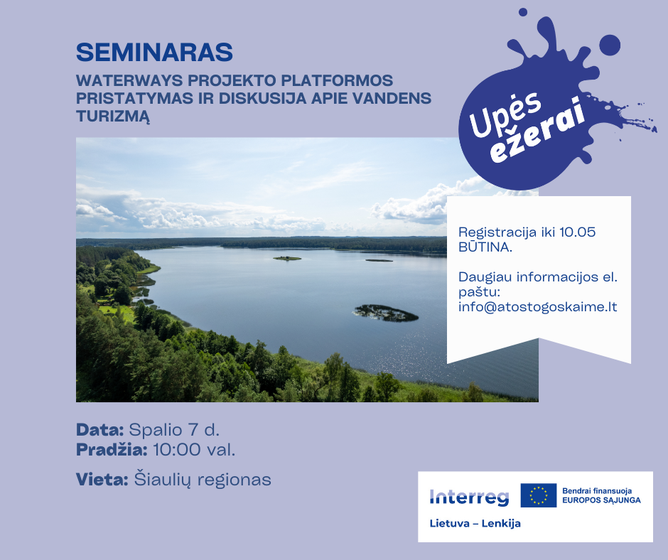 Po sėkmingų susitikimų įvairiuose Lietuvos regionuose, Lietuvos kaimo turizmo asociacija kviečia jus į paskutinį WaterWays projekto seminarą, kuris vyks spalio 7 d. Šiaulių rajone.